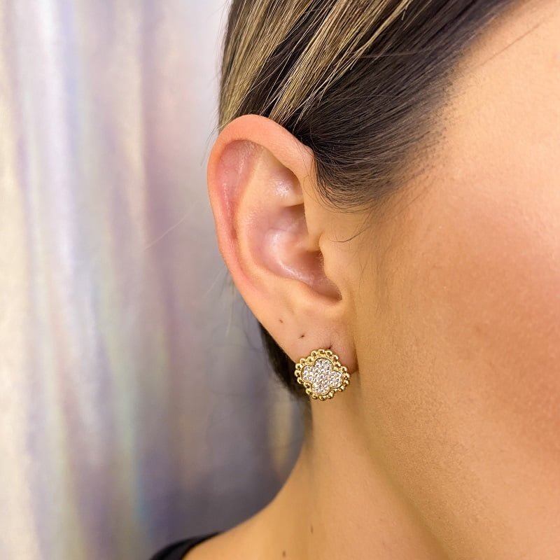 Em até 3x de R$ 14,97 sem juros Inspirado na alta joalheria, esse brinco de trevo é essencial para compor qualquer look. Esse modelo de brinco possui o design de trevo e é inteiro cravejado com micro zircônias. Os trevos são conhecidos como amuletos da sorte, trazendo prosperidade para as nossas vidas. Combine com modelinhos de piercings fakes e colares mais delicados para um look encantador e moderno.