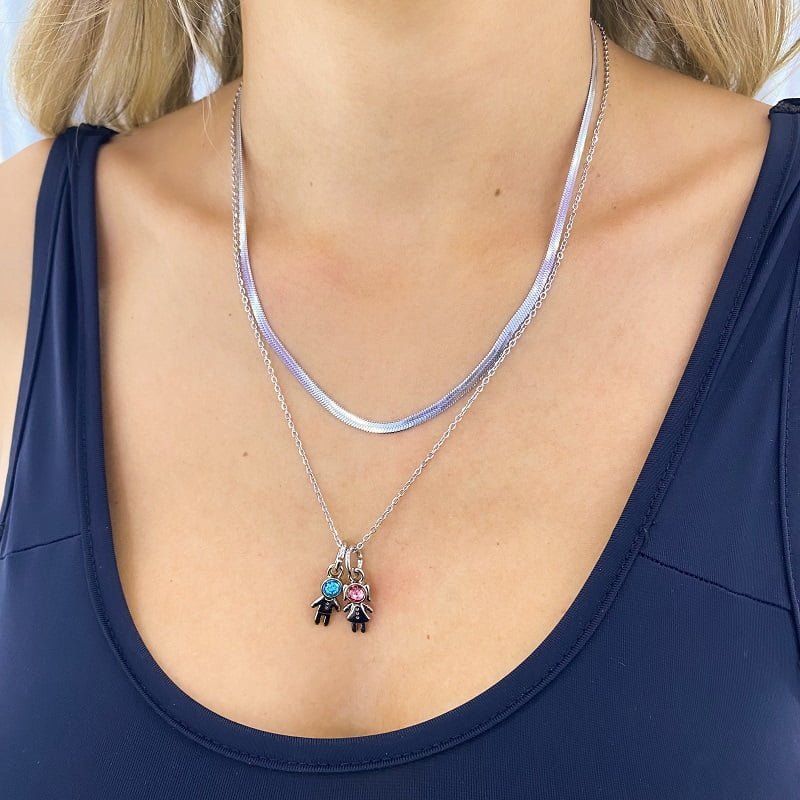 O colar filhos é composto por uma corrente de elos fina e com pingentes, que você personaliza conforme sua preferência, em formato de menina e ou menino com um strass na cor cristal, rosa ou azul. É uma peça linda e moderna, perfeita para você usar ou presentear pessoas especiais. Esta peça pode ser usada em diversas ocasiões e já é uma das queridinhas aqui da Mystic por trazer o simbolismo de carregar consigo sempre seus filhos e estar na moda. Use sozinho ou combine com outros acessórios e arrase!