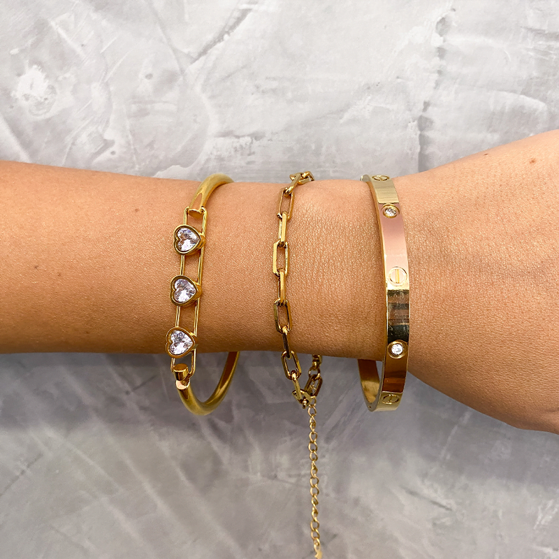 Bracelete trio de coração em zircônia dourado – aço inoxidável