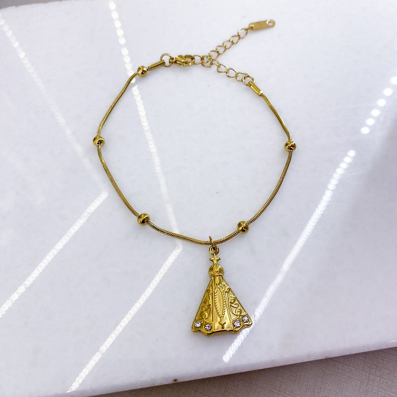 Pulseira rabo de rato bolinhas N. Sra. Aparecida cristal dourada – aço inoxidável